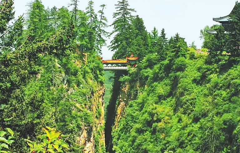 其實(shí),石門山系小隴山林區(qū)的余脈,蘊(yùn)藏著得天獨(dú)厚的植物資源,有我國南北的各種野生植物百余種,其中有很多還是園林中的珍品。據(jù)景區(qū)資料得知,石門山由北峰、麒麟峰、南峰構(gòu)成。北峰建有無量殿、靈官殿、文昌宮、三清殿、鐘樓。麒麟峰建有圣母宮、三肖殿、三仙庵。南峰峰頂建有玉皇閣和三官殿。這些殿宇大多為明清重修,依山就勢,錯(cuò)落有致,風(fēng)格纖巧,玲瓏俊秀,最小的殿宇僅有5至6平方米,在石門山的萬綠叢中時(shí)隱時(shí)現(xiàn),猶如一幅濃淡相宜,層次分明的水墨畫,形成了石門山特有的風(fēng)韻。