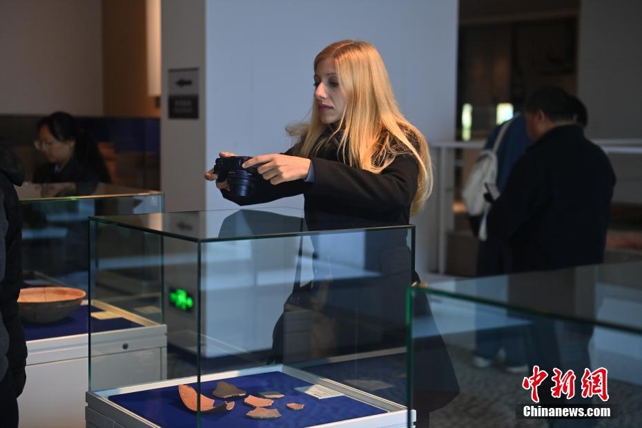?。保霸拢玻踩眨玻埃玻辞嗄隄h學(xué)家研修計(jì)劃甘肅班團(tuán)隊(duì)22個(gè)國家的青年漢學(xué)家,走進(jìn)甘肅省天水市秦安縣大地灣遺址參觀并進(jìn)行專題研修。大地灣遺址是新石器時(shí)代大型聚落遺址,出土了中國乃至世界上最早的彩陶文化、最早的文字符號(hào)、種植生產(chǎn)了中國第一批糧食品種黍、出現(xiàn)了最早的宮殿式建筑、發(fā)明了世界最早的水泥地面、創(chuàng)造了最早的繪畫作品——F411地畫。圖為國外青年漢學(xué)家拍攝大地灣博物館藏品。中新社記者 李亞龍 攝