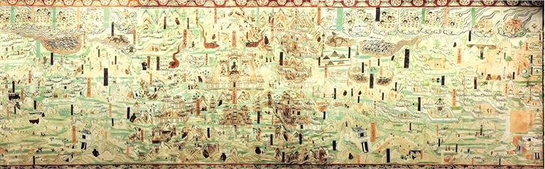 莫高窟61窟,建于五代晚期,是河西歸義軍節(jié)度使曹元忠及夫人開鑿的功德窟,又稱“文殊堂”,主要為供奉文殊菩薩而修。該窟的亮點(diǎn)是西壁的巨幅五臺山圖。這是敦煌壁畫中規(guī)模最大的山水人物圖,也是全景式歷史地圖。五臺山圖長13.6米,高3.5米,畫中詳細(xì)描繪了東起河北正定,西至山西太原,方圓五百里的山川地形及社會風(fēng)情,再現(xiàn)了五代時期五臺山佛國圣境的氛圍。