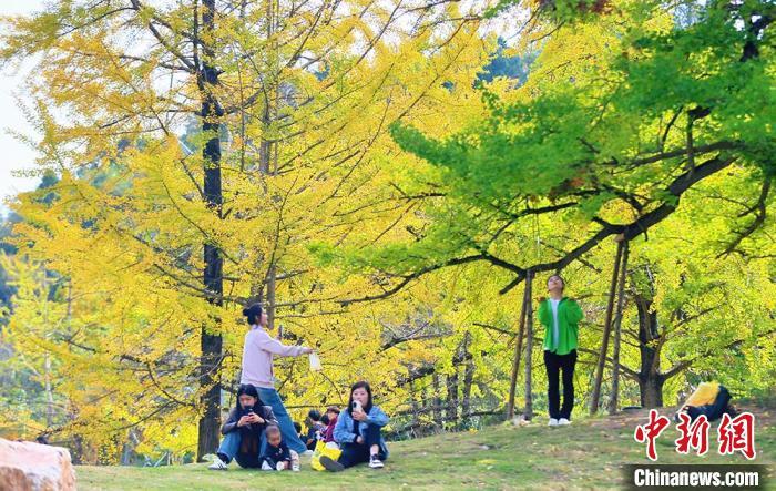 中新網(wǎng)蘭州10月28日電(高展)“霜降”過(guò)后銀杏黃。秋陽(yáng)映照下,甘肅隴南市徽縣嘉陵鎮(zhèn)田河村宛如披上絢麗新裝,詩(shī)意夢(mèng)幻。此地四周青山環(huán)抱,嘉陵江如靈動(dòng)絲帶蜿蜒流淌,水豐土腴、氣候溫潤(rùn),為銀杏營(yíng)造絕佳生長(zhǎng)環(huán)境?;湛h委副書記、縣長(zhǎng)王福全稱,銀杏,不僅承載著千年的歷史沉淀,更以其獨(dú)特的風(fēng)姿和韻味,成為徽縣一張亮麗的名片。