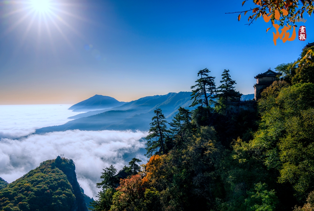 彩林、云海、樓閣……山巒迭翠,蒼黛凝重,綠林和遠處曼妙的山峰構成了一幅流動的水墨丹青。
