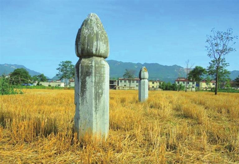 平闊的川地,村人已把一地莊稼收入自己殷實(shí)的谷倉,田野涂遍了陽光的顏色。遠(yuǎn)遠(yuǎn)地,我們就看見一座有兩尊八楞蓮苞頭華表矗立在田野之間,在另一塊地里,還有一個僅裸露肩膀于地表、頭顱已缺失的石翁仲,圓領(lǐng)官服、胸垂綬帶的文官裝束隱約可見……
