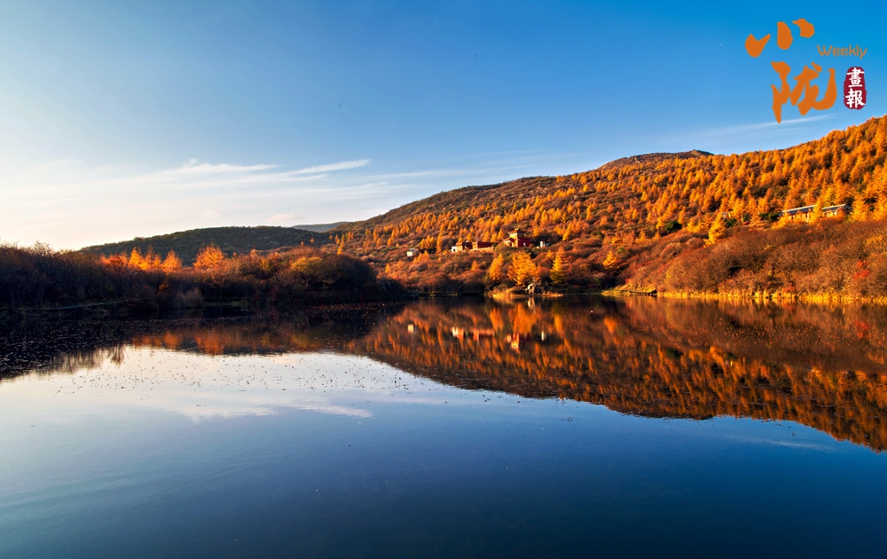 群山環(huán)抱里的朝那湫,水面開闊,清澈透明,周圍層林盡染,藍(lán)天、蘆葦?shù)褂霸诿鲀舻乃嫔希∷埔环^妙的山水風(fēng)景圖。
