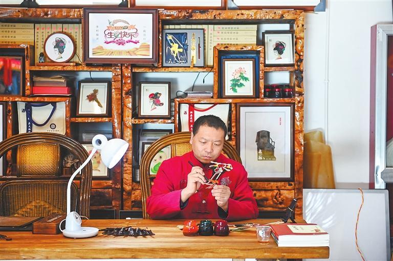 手工藝人張治文借鑒民間剪紙的傳統(tǒng)手法,以牛皮為料,按照制皮、過樣、雕刻、著色、出水、裝訂等工序精心制作一張張皮影。道情皮影既是演出的道具又是獨立的藝術(shù)品,魅力在于其獨特的表演形式和精湛的制作工藝。