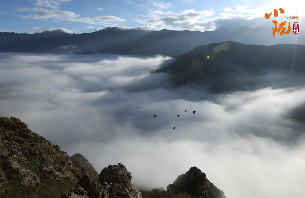 側(cè)目而視,近日一場降雪和夏日閑云相伴相依,近處的雪和遠(yuǎn)處的云相映成趣,共同把天空擦拭得深藍(lán)如鏡。這種“積雪長留峰素裹,浮云飄忽去無邊”的夢幻景色,會(huì)將你平日里積蓄在心頭的那些世俗凡塵濯洗得干干凈凈,有一種遠(yuǎn)離人世的幻覺。