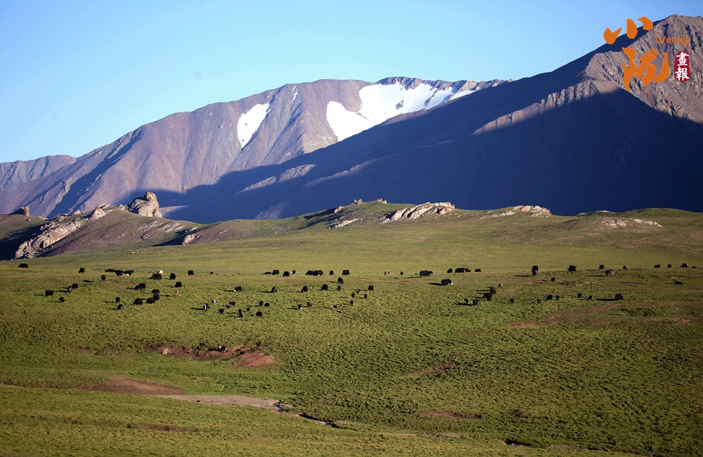 初夏時(shí)節(jié),祁連山國家公園張掖肅南縣境內(nèi),天空湛藍(lán)如洗,草原碧綠廣闊,巍峨的雪山仿佛插入云端,牛羊在青草中覓食,勾勒出一幅天然秀麗的生態(tài)畫卷。