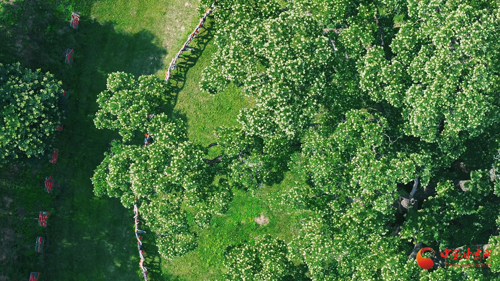盛夏時節(jié),崇信縣錦屏鎮(zhèn)關河村的“華夏古槐王”迎來盛花期。3200歲的“活文物”枝頭繁花似雪,與隴東南的青山黛色相映成趣。
