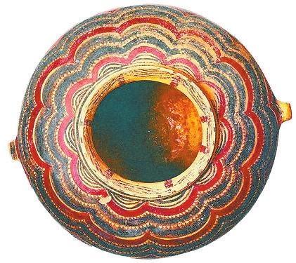 其中以馬家窯文化彩陶為代表,蘊含著眾多神秘的社會文化信息,以線條作為造型手段、以黑色(墨色)作為主要基調(diào),奠定了中國畫發(fā)展的歷史基礎與以線描為特征的基本形式。馬家窯文化彩陶也是中國音樂舞蹈的開端呈現(xiàn)。1973年,甘青地區(qū)大通縣出土的馬家窯文化彩陶舞蹈紋盆,內(nèi)壁繪舞蹈人物3組,每組5人,令人感受到遠古舞蹈強烈的節(jié)奏感。1991年,甘肅武威市發(fā)現(xiàn)的彩陶舞蹈紋盆,內(nèi)壁繪有兩組手拉手的舞蹈人物,每組9人,舞蹈人數(shù)更多。1995年,宗日遺址再次出土一件馬家窯文化彩繪舞蹈紋盆,內(nèi)壁所繪舞蹈人物兩組,分別為11人和13人,給人一種優(yōu)雅的舞蹈意境。1986年,甘肅省永登縣出土馬家窯文化的彩陶鼓。這些珍貴的彩陶器物成為研究中國原始歌舞和音樂起源的佐證。