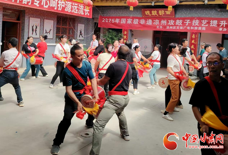 中國(guó)甘肅網(wǎng)7月19日訊(西北角·中國(guó)甘肅網(wǎng)記者 張振國(guó) 文/圖)為扎實(shí)推進(jìn)國(guó)家級(jí)非物質(zhì)文化遺產(chǎn)項(xiàng)目傳承與保護(hù),系統(tǒng)提升涼州攻鼓子團(tuán)隊(duì)專業(yè)水平,發(fā)展壯大攻鼓子傳承人隊(duì)伍。7月16日,由涼州區(qū)文體廣電和旅游局主辦、涼州區(qū)文化館承辦的2025年涼州攻鼓子傳承人技藝提升培訓(xùn)班分別在“涼州攻鼓子傳習(xí)所”和“四壩鎮(zhèn)非遺民俗文化館”開(kāi)班。