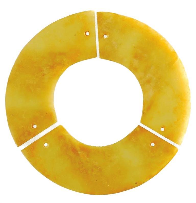 玉璜長11.5厘米、寬3.5厘米、厚0.3厘米,征集所得。青玉料,色灰白,有黃褐或灰白沁斑,質(zhì)地細(xì)潤透亮。弧形片狀,共三塊。每塊兩端邊齊直,并各有一個單面鉆小孔,制作規(guī)整。