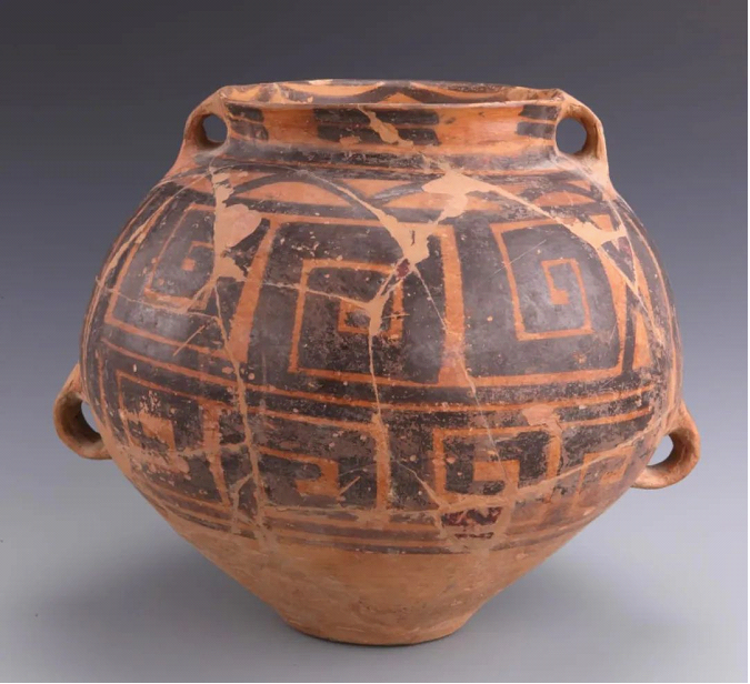描述:泥質(zhì)橙黃陶,侈口,短束頸,斜肩,垂折腹,平底,肩部有對稱雙耳,施黑紅彩,口沿內(nèi)飾垂弧紋,頸飾平行條紋,肩飾反向的回形紋,腹部為寬帶紋,其間飾點(diǎn)紋。