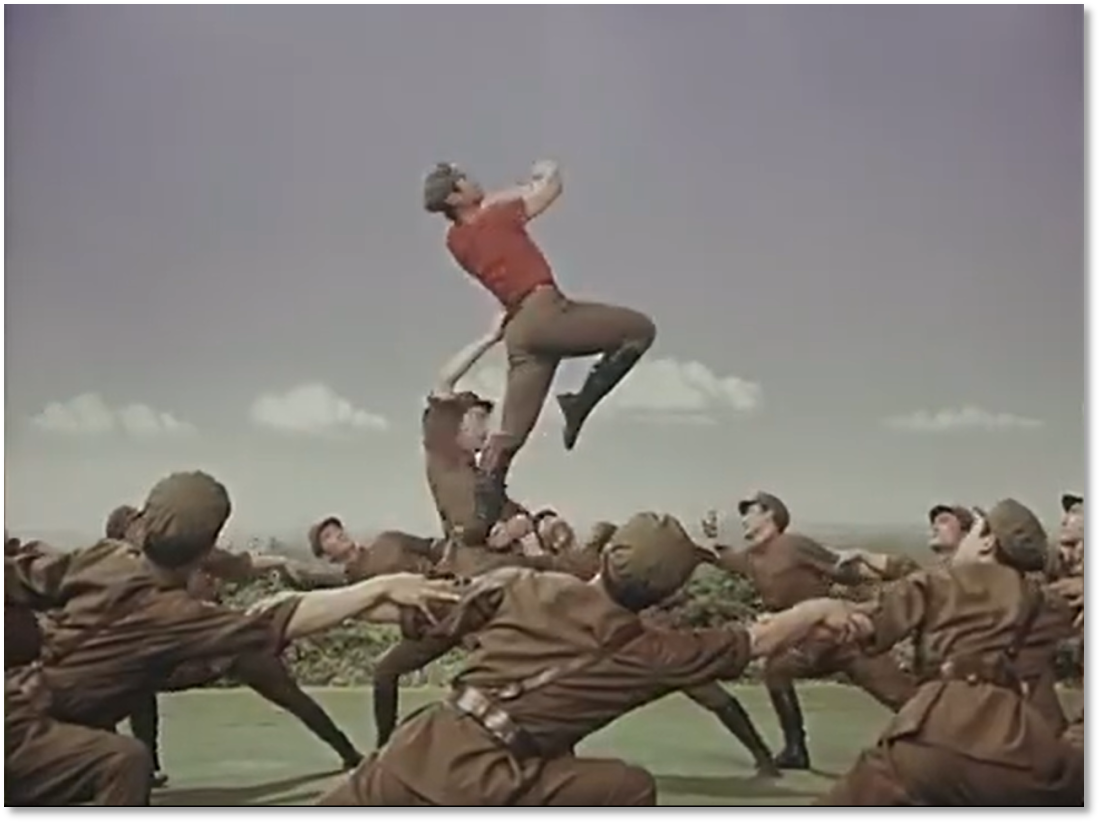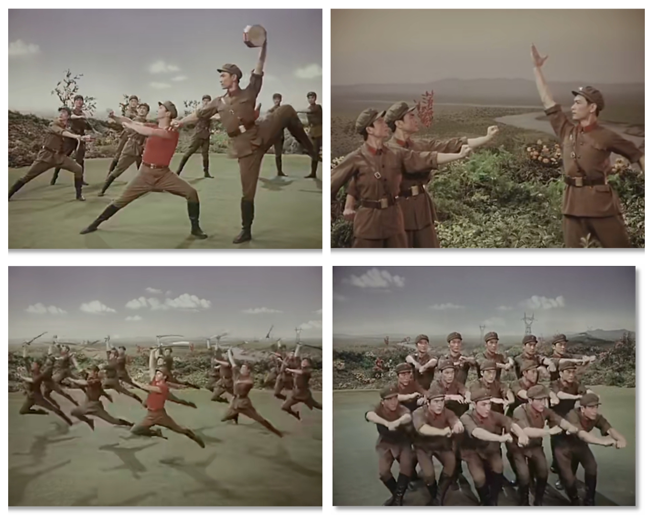 有趣的是,膠片并非被動記錄,它悄然行使著選擇的權(quán)力——它決定了后世的人們將以何種視角、何種景別來銘記《戰(zhàn)馬嘶鳴》。在鏡頭中定格下來的膠片拷貝,就此定義了經(jīng)典的面貌。從舞臺到膠片,作品完成了一次關(guān)鍵的媒介化轉(zhuǎn)身,從一場限時演出,變身為一個時代的文化符號。這使軍藝精神在沒有數(shù)字媒體的時代,得以廣泛流傳和保存。