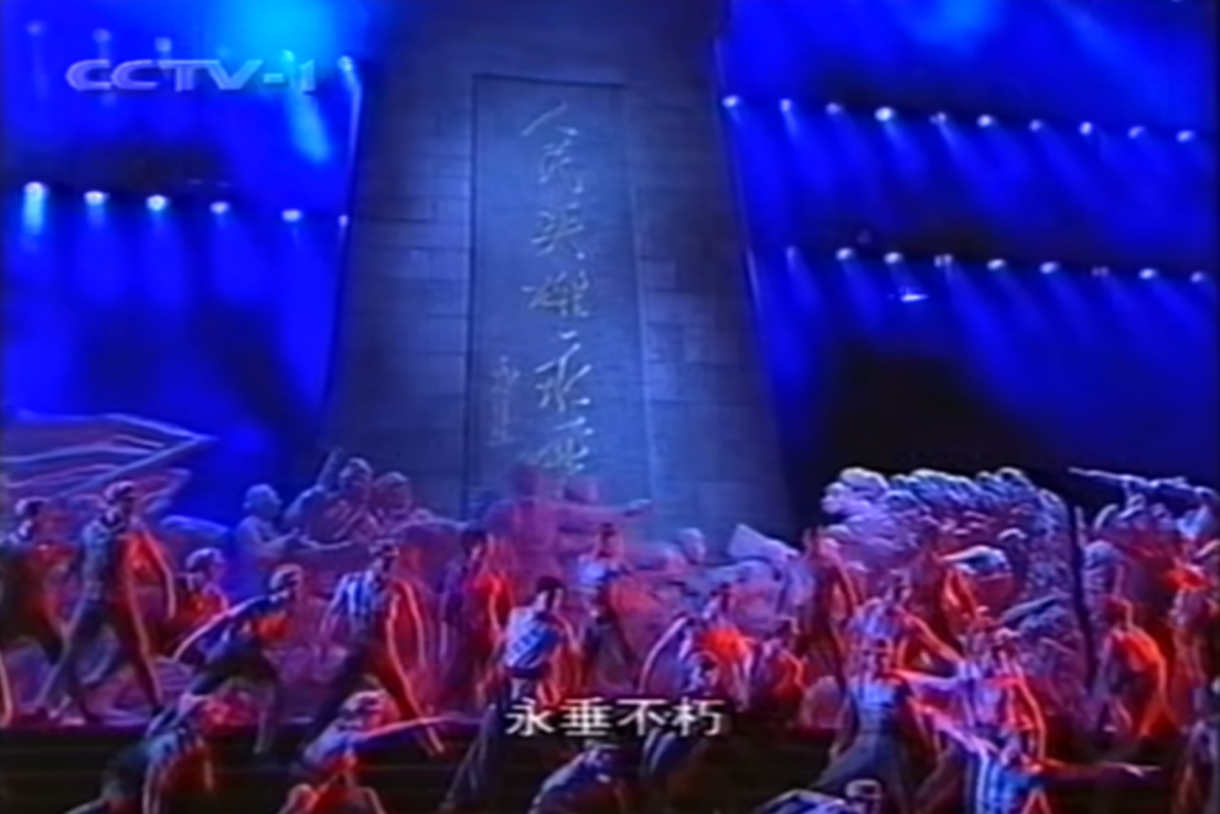 人民英雄紀念碑在舞臺上所承載的最主要的意象即歷史,而且特指1840年以后中國人民的革命歷史,其次是對英雄先烈的緬懷,演員們以解放軍裝束圍繞在人民英雄紀念碑下,呈靜默群雕的形象,姿態(tài)肅穆低垂,形成“紀念碑式”靜態(tài)場面,既是復(fù)刻靜止的浮雕形象,也是可供人敬仰的鮮活英雄。