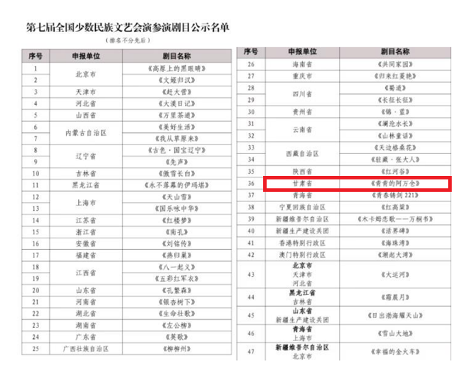 近日,國家民委正式發(fā)布《第七屆全國少數(shù)民族文藝會演參演劇目公示名單》。經(jīng)嚴(yán)格遴選與層層審核,由甘肅省委宣傳部、省委統(tǒng)戰(zhàn)部指導(dǎo),省民委、省文旅廳、省文聯(lián)、省衛(wèi)健委、甘肅演藝集團聯(lián)合出品,甘肅省話劇院傾力創(chuàng)排演出的話劇《青青的阿萬倉》成功入圍。
