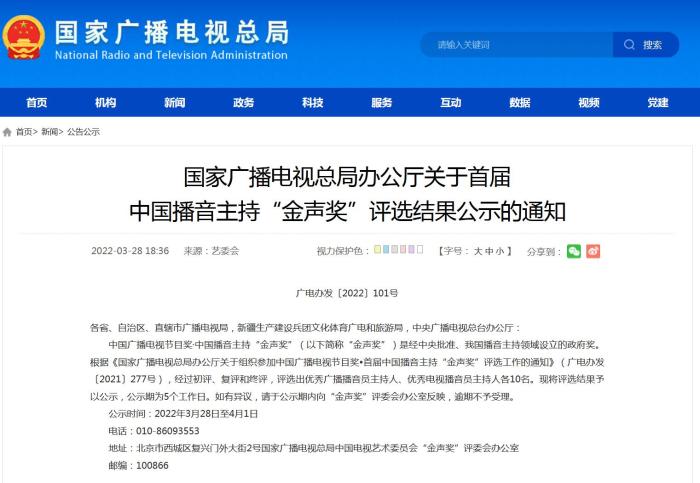 《通知》指出,根據(jù)《國家廣播電視總局辦公廳關于組織參加中國廣播電視節(jié)目獎•首屆中國播音主持“金聲獎”評選工作的通知》(廣電辦發(fā)〔2021〕277號),經(jīng)過初評、復評和終評,評選出優(yōu)秀廣播播音員主持人、優(yōu)秀電視播音員主持人各10名。現(xiàn)將評選結(jié)果予以公示,公示期為5個工作日。