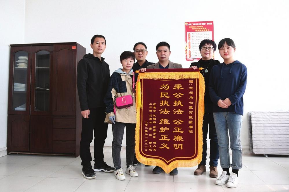 中國(guó)甘肅網(wǎng)10月27日訊 據(jù)蘭州晚報(bào)報(bào)道(記者 許沛潔 文/圖) “今天,我們專程過來感謝各位檢察官。你們維護(hù)了公平正義,如果沒有檢察院的依法監(jiān)督,我們這8個(gè)家庭就要背負(fù)287萬元的債務(wù)!”這份感謝來自七里河區(qū)檢察院辦理的一起民事審判監(jiān)督系列案件的多名申請(qǐng)人。10月26日,他們將一面錦旗交到了七里河區(qū)檢察院梁德安副檢察長(zhǎng)和第四檢察部負(fù)責(zé)人手中,表達(dá)對(duì)辦案檢察官的感謝之情。