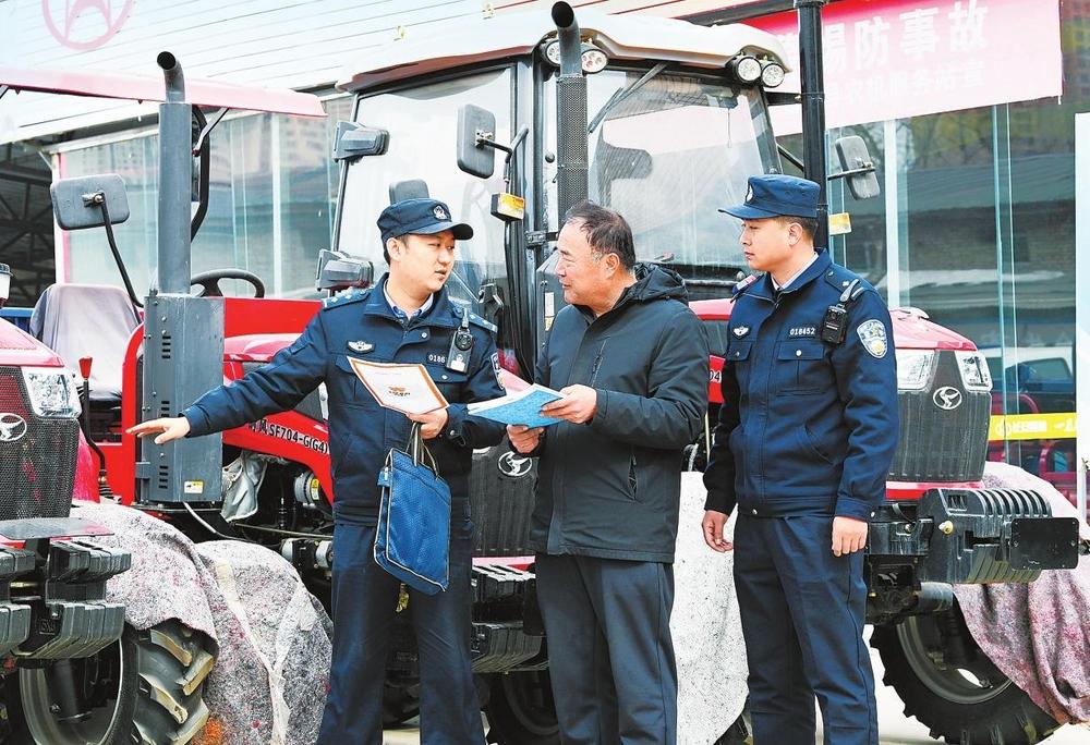 民警向農(nóng)機(jī)經(jīng)營者了解情況。榆中縣公安局城關(guān)派出所民警正在一家農(nóng)機(jī)超市里開展安全檢查,為春耕生產(chǎn)保駕護(hù)航。 新甘肅·甘肅法治報通訊員張軍揚(yáng)攝