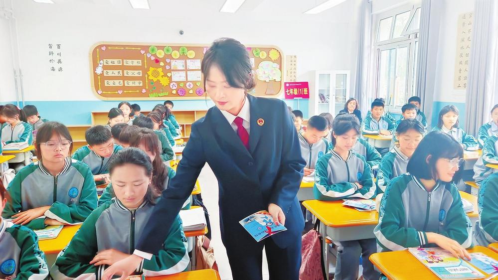 檢察干警走進(jìn)校園向?qū)W生發(fā)放宣傳資料。