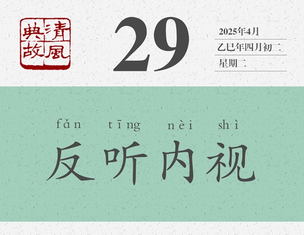 后人將“反聽之謂聰,內(nèi)視之謂明”縮減為“反聽內(nèi)視”四個(gè)字,并以此為典提醒人們,對(duì)外要虛心聽取別人的批評(píng)意見,對(duì)內(nèi)要及時(shí)反省自己的所作所為?!逗鬂h書·王允傳》:“夫內(nèi)視反聽,則忠臣竭誠(chéng);寬賢矜能,則義士厲節(jié)。”