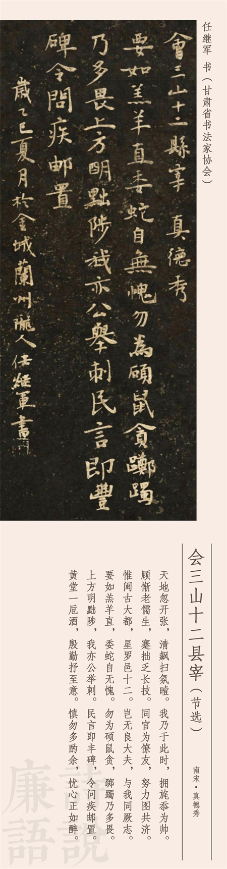 公元1232年,南宋官員真德秀到福州擔(dān)任知府,到任后把下轄12個(gè)縣的知縣召集在一起集體談話(huà),擺事實(shí)、講道理,談廉政、申紀(jì)律,事后將談話(huà)內(nèi)容寫(xiě)成了詩(shī),就是今天我們看到的這首作品。這是一首五言敘事詩(shī),長(zhǎng)達(dá)250字,這里我們節(jié)選后半部分。