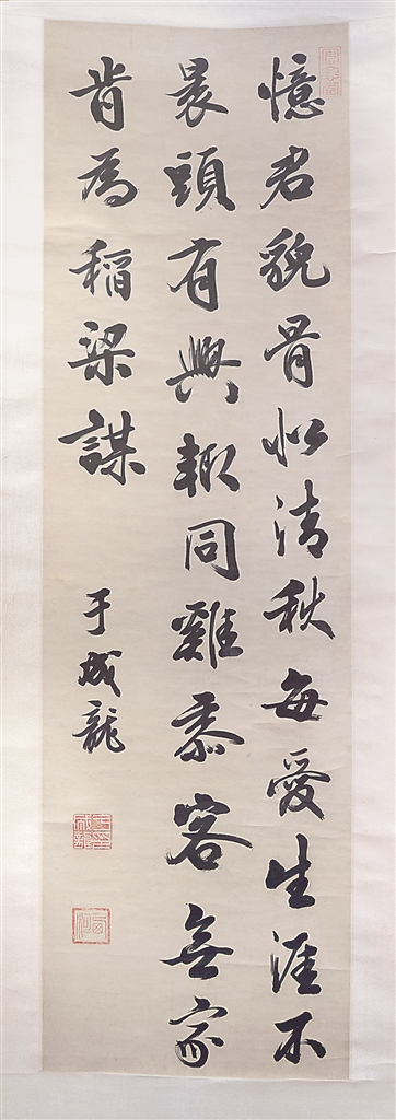 《于成龍行書詩(shī)軸》:憶君貌骨似清秋,每愛生涯不裹頭。有興輒同雞黍客,無(wú)家肯為稻粱謀。劉同華 攝