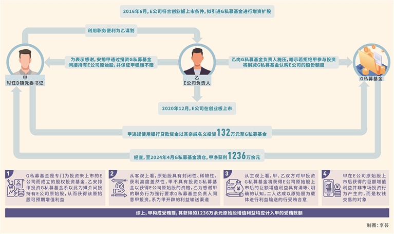 其中,2016年6月,E公司符合創(chuàng)業(yè)板上市條件,擬引進(jìn)G私募基金和H私募基金進(jìn)行增資擴(kuò)股。乙為感謝甲在企業(yè)用地審批等方面提供的幫助,提議安排甲通過(guò)投資G私募基金(該基金是專(zhuān)門(mén)為投資未上市的E公司而成立的股權(quán)投資基金,按照每股5.5元的價(jià)格取得E公司股本600萬(wàn)股,并辦理相應(yīng)的變更登記手續(xù))間接持有E公司原始股,并告知甲E公司擬上市情況以及其會(huì)與G私募基金簽訂對(duì)賭協(xié)議(若E公司未實(shí)現(xiàn)上市,G私募基金有權(quán)要求乙原價(jià)回購(gòu),并按照年利率10%支付補(bǔ)償款),甲無(wú)需承擔(dān)市場(chǎng)風(fēng)險(xiǎn),穩(wěn)賺不賠,甲表示同意。此后,乙向G私募基金負(fù)責(zé)人施壓,暗示若拒絕甲參與投資將削減G私募基金認(rèn)購(gòu)E公司的股份額度,并將該額度交由其競(jìng)爭(zhēng)對(duì)手H私募基金認(rèn)購(gòu)。隨后,甲違規(guī)使用銀行貸款資金以其親戚名義投資132萬(wàn)元至G私募基金(根據(jù)相關(guān)規(guī)定,私募基金投資者應(yīng)當(dāng)具備相應(yīng)資金實(shí)力,不得用貸款資金從事股本權(quán)益性投資,甲的行為不符合規(guī)定)。2019年6月,I私募基金以每股11.52元溢價(jià)收購(gòu)G私募基金持有的部分E公司股份。2020年12月,E公司在創(chuàng)業(yè)板上市。經(jīng)查,至2024年4月G私募基金清倉(cāng),甲凈獲利1236萬(wàn)余元。