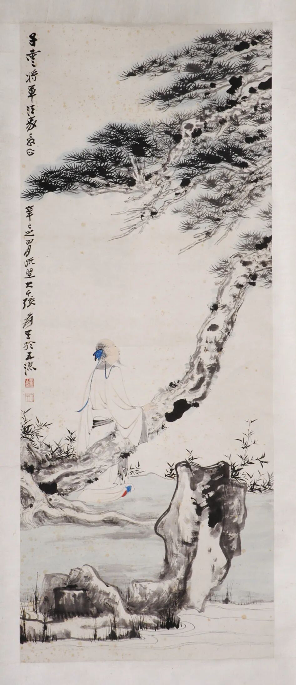 在松與士的意象組合上,張大千運用“攢針”與“點簇”相結(jié)合的技法,通過墨色濃淡變化,既表現(xiàn)松針的茂密層次,又展現(xiàn)枝干的虬曲質(zhì)感。高士形象以簡練而富有彈性的線條勾勒,衣紋處理融匯了唐代吳道子“吳帶當(dāng)風(fēng)”的飄逸與宋代李公麟“鐵線描”的勁挺,更注入張大千自創(chuàng)的雄渾筆性。人物神情安詳,目視遠(yuǎn)方,與蒼松形成虛實相生的藝術(shù)效果。