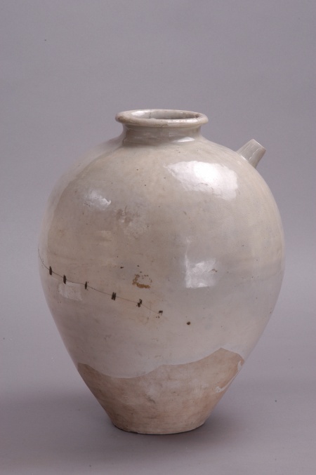 唐代,移交,初出土于武威弘化公主墓。高40.5厘米,口徑12厘米,底徑12.3厘米。圓唇,小口外卷沿,束頸,圓肩,下腹斜收,平底。肩部斜置一管狀短流。胎表有白色化妝土,通體施白釉,釉不及底,釉面光潤且有細碎冰裂紋。器身無花紋,造型規(guī)整、飽滿,具有鮮明的唐代風格。