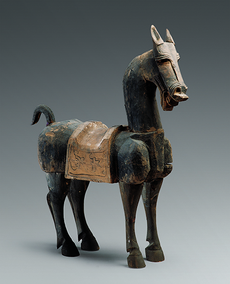 漢代,武威市磨嘴子漢墓出土。高87厘米,長(zhǎng)72厘米。木馬形體高大,張嘴嘶鳴,四足直立,作佇立狀。通體涂黑,用刀刻出眼、鼻、唇,尾后舉下垂。馬鞍用白粉涂底,上以黑色勾畫出云氣紋。整體造型雄渾質(zhì)樸,生動(dòng)傳神。