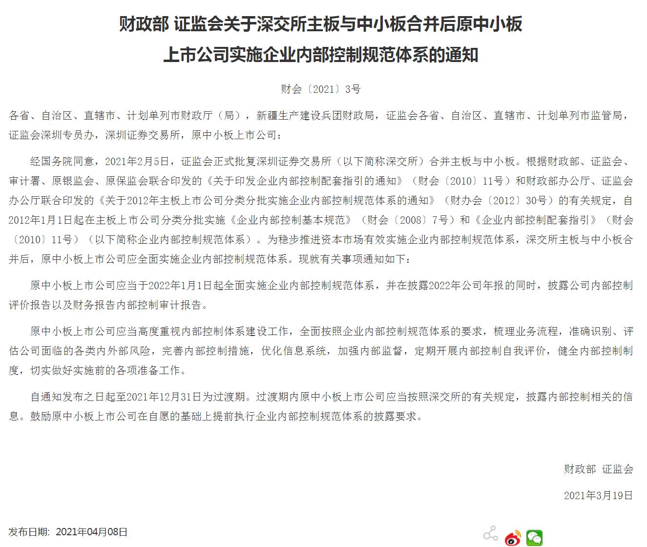 通知明確,原中小板上市公司應(yīng)當(dāng)于2022年1月1日起全面實(shí)施企業(yè)內(nèi)部控制規(guī)范體系,并在披露2022年公司年報(bào)的同時(shí),披露公司內(nèi)部控制評(píng)價(jià)報(bào)告以及財(cái)務(wù)報(bào)告內(nèi)部控制審計(jì)報(bào)告。