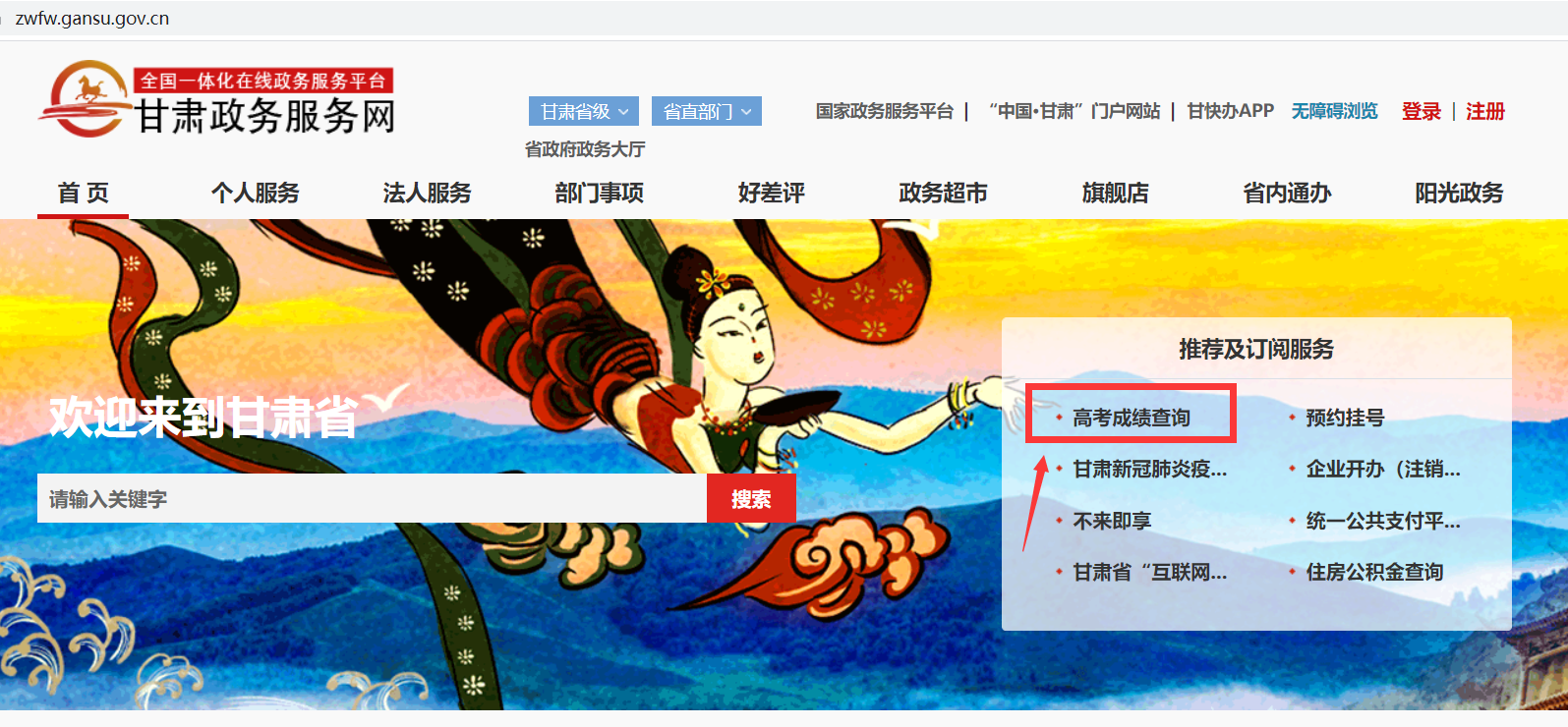 打開“甘肅政務服務網(wǎng)”https://zwfw.gansu.gov.cn/,在首頁“推薦及訂閱服務”欄目,點擊“高考成績查詢”進入查詢頁面,輸入考生號、身份證號即可查詢。