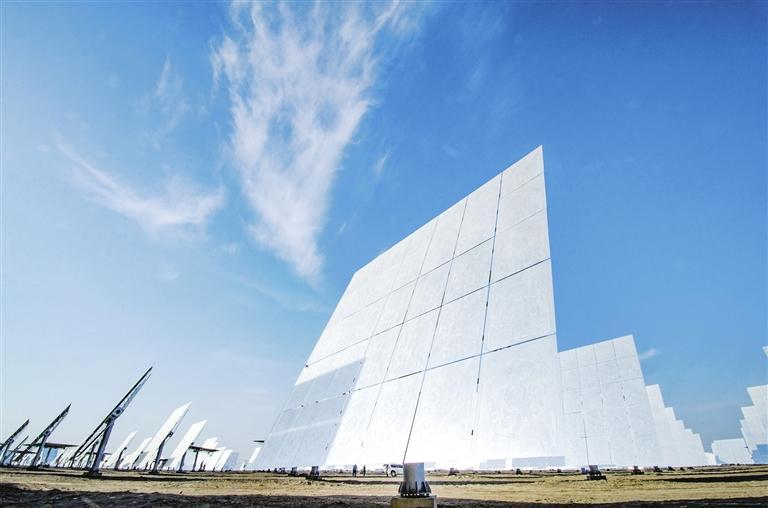 一排排風(fēng)電機(jī)組整齊列陣迎風(fēng)旋轉(zhuǎn),蔚然壯觀;成片的光伏板將茫茫戈壁裝點(diǎn)成浩瀚的藍(lán)色海洋,熠熠生輝;上萬(wàn)塊定日鏡和吸熱塔構(gòu)成超級(jí)鏡子發(fā)電站,耀眼且震撼。