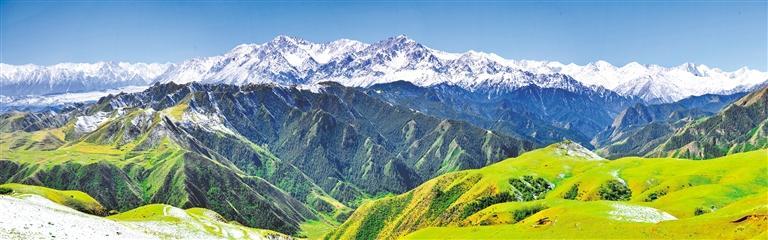 初秋的祁連山,碧空如洗,遠(yuǎn)峰疊翠。山頂?shù)姆e雪在陽光照射下閃閃發(fā)光,陣陣清風(fēng)拂過黃綠交錯(cuò)的山林,驚起幾只飛鳥……