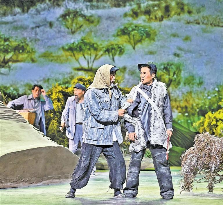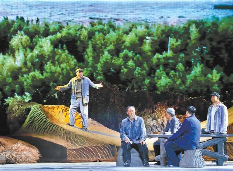 現(xiàn)實題材是話劇藝術(shù)的寵兒,在話劇進入中國一百多年的時光中,現(xiàn)實題材創(chuàng)作占據(jù)相當大的比例。在近當代中國歷史的進程中,話劇始終起著敢為天下先、針砭時弊的作用,但話劇又有其極其特殊的藝術(shù)框范。人們在觀看話劇時,仿佛就是在觀看自己的人生,觀看自己和身邊最熟悉的人們,這是話劇藝術(shù)獨具的極高的審美要求。尤其是現(xiàn)代題材的創(chuàng)作,稍有不慎便會陷入同質(zhì)化的僵硬模式,使舞臺藝術(shù)失去應有的美感。話劇《八步沙》讓6個老漢成為舞臺聚光燈下的主角,體現(xiàn)了創(chuàng)作者們呼應時代之需,為最普通的農(nóng)民寫生立傳的拳拳之心。6個老農(nóng)民談不上人們通常意識中的“美”,“治沙”這樣的故事也相對比較單調(diào),不大容易出彩,而創(chuàng)作者們以八步沙這個真實的地名作為劇名,以“六老漢”治沙這個真實的事件作為全劇的敘述內(nèi)容,卻能宕開一筆把特定的外部環(huán)境與人物的內(nèi)心世界巧妙地融為一體,為全劇注入了濃郁飽滿的戲劇情境和情感,使這部話劇有了獨屬于自己的一份力度、一份無法替代的光彩。全劇的情節(jié)一曲三折,以小見大,當黑壓壓的沙塵暴鋪天而來的時候,當六老漢在嚴酷的環(huán)境中吃盡苦頭,摸索出“一棵樹,一把草,壓住沙子防風掏”的寶貴經(jīng)驗,使漫無邊際的沙漠終于出現(xiàn)一抹綠色,繼而眼看著一棵又一棵綠樹成活成林,終于成為一片綠洲的時候,我相信觀眾的心也被藝術(shù)琴弦撥動,始終被劇情牽著走,為劇中人物的命運擔心、懸心、痛心、開心,從中深深地感受到劇中所蘊藏的豐富內(nèi)涵和它所傳達出的真切意趣。