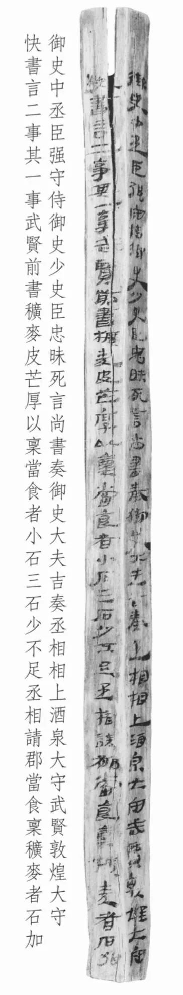 此簡(jiǎn)為漢宣帝回復(fù)酒泉太守“辛武賢”和敦煌太守“快”奏疏的恩準(zhǔn)詔書,簡(jiǎn)文記載的是皇帝詔書中對(duì)兩太守奏疏內(nèi)容的復(fù)述。從簡(jiǎn)文內(nèi)容看,酒泉太守辛武賢和敦煌太守快給朝廷的奏疏主要涉及兩件事情:一是辛武賢認(rèn)為作為糧草的穬麥因皮厚芒長(zhǎng),如按規(guī)定每人發(fā)放小石三石,會(huì)造成實(shí)際數(shù)量的不足,所以他請(qǐng)求皇帝每石加發(fā)若干。另一件事顯然是敦煌太守快的上書,但文字未能容納于此簡(jiǎn),故不得而知。