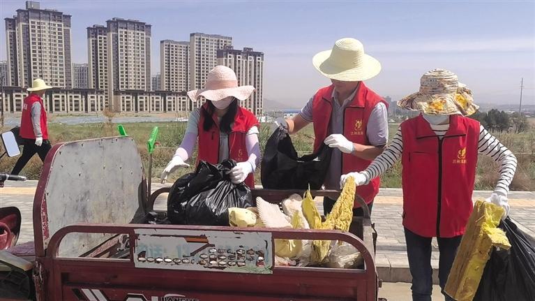 在劉先生身后不遠(yuǎn)處,志愿者、網(wǎng)格員、環(huán)衛(wèi)工人等正在清理路旁垃圾,此時(shí)正值上午10時(shí)30分,驕陽(yáng)似火,在經(jīng)四路與緯二十二路交界處,大家不畏炎熱,認(rèn)真撿拾著散落四處的垃圾,不論是煙頭紙片、白色垃圾,還是在雜草間的雜物,都被一一撿出,放在隨身攜帶的垃圾袋中,統(tǒng)一放回垃圾清運(yùn)車。