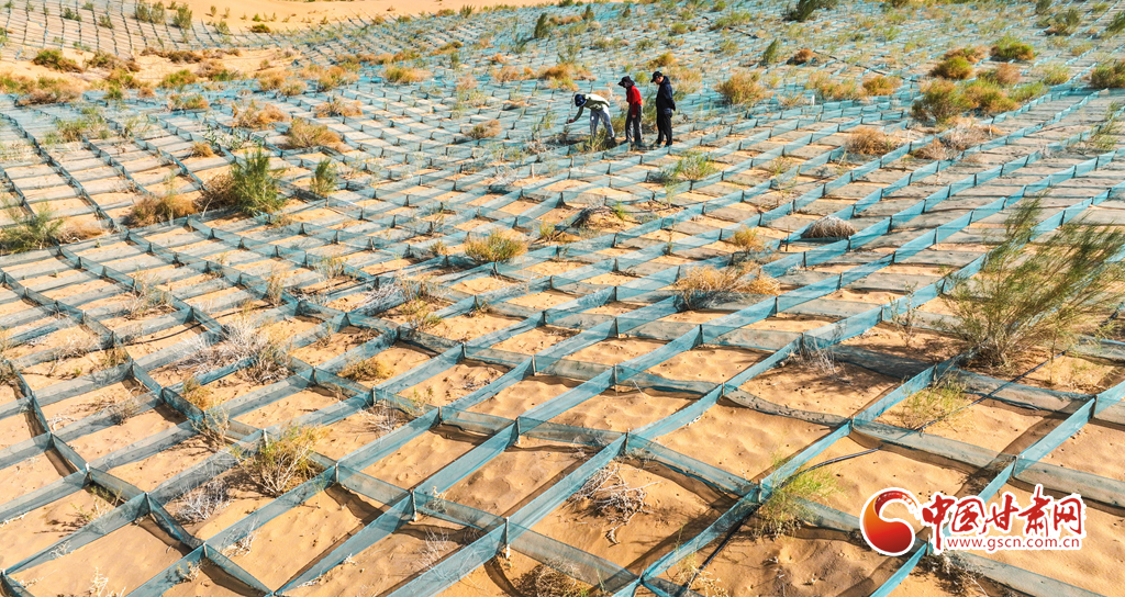 連日來,甘肅省張掖市臨澤、高臺北部荒漠區(qū)防沙治沙區(qū)內(nèi),群眾在防沙治沙工程現(xiàn)場共同壓沙障、栽梭梭、澆水管護、筑牢“阻沙網(wǎng)”,塑緊“防沙衣”,連綿起伏的沙漠上,麥草方格沙障一望無際,栽植的梭梭等植物迎風挺立,煥發(fā)蓬勃生機。