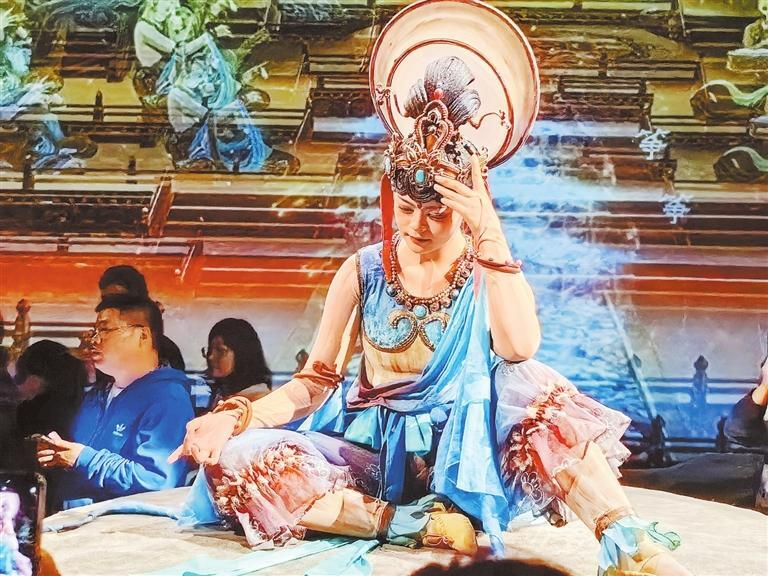 “真是一場(chǎng)酣暢淋漓的敦煌樂(lè)舞盛宴。雖然這趟旅程我們還沒(méi)有去敦煌莫高窟,但看罷這場(chǎng)演出,已經(jīng)對(duì)莫高窟壁畫(huà)有了初步的認(rèn)知。莫高窟壁畫(huà)的精華部分,借助高科技手段和演員的精彩演繹,在我們眼前立體延展開(kāi)來(lái),同時(shí)劇場(chǎng)內(nèi)大量復(fù)刻了佛龕、蓮花臺(tái)、藻井等特色形制,讓我們‘一眼入境’,帶我們走進(jìn)歷史深處,觸摸文明脈動(dòng)。”浙江游客王松攜家人觀看《樂(lè)動(dòng)敦煌》后,發(fā)出贊嘆。