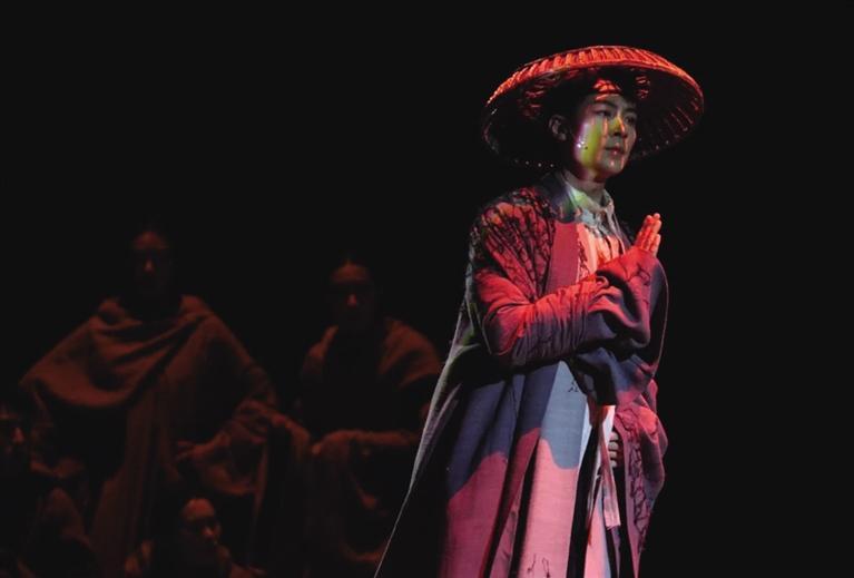 在音樂劇《飛天》的舞臺上,敦煌元素豐富,各色形象躍然而出。無論是對《鹿王本生》《千釘求法》《入海求珠》《舍身飼虎》四則經(jīng)典故事的再現(xiàn),還是九色鹿、烏鴉、勞度叉、枇楞揭梨、公主、善友等各色形象的還原,抑或對第257窟、第275窟、第296窟、第428洞窟等石窟壁畫的描摹再現(xiàn),古今歷史的交疊盡現(xiàn)眼前……敦煌壁畫中那些靜默千年的人物,宛如靈魂覺醒般緩緩浮現(xiàn),穿越了千年的歲月長河,與觀眾進行了一場跨越時空的深情對話。