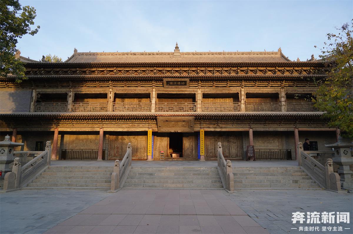 大佛殿正中,臥佛安然酣睡,佛身長(zhǎng)35米,肩寬7.5米。造像木胎泥塑,金妝彩繪,頭枕蓮臺(tái),面西而臥。雙眼半閉,嘴唇微啟,姿態(tài)安詳。臥佛首足處塑大梵天、帝釋天立像,身后為十大弟子舉哀像,南北兩側(cè)塑十八羅漢群像,造型精美,栩栩如生。殿身兩層樓閣,青瓦飛檐、朱柱環(huán)立,殿門(mén)兩側(cè)有佛經(jīng)變故事磚雕,四周墻面及上層板壁繪明清時(shí)期諸天禮佛、山海經(jīng)故事、西游記故事及佛經(jīng)變故事壁畫(huà),面積約530平方米。