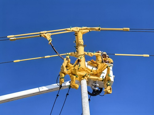 作業(yè)現(xiàn)場,嚴(yán)寒逼人,但準(zhǔn)備井然有序。該公司相關(guān)負(fù)責(zé)人提前組織現(xiàn)場勘查,制定“三措一案”,反復(fù)預(yù)演操作流程。絕緣斗臂車、絕緣手套、遮蔽毯等器具逐一檢查確認(rèn),確保萬無一失。上午11時10分,兩名作業(yè)人員穿戴好絕緣防護(hù)裝備,乘絕緣斗臂車緩緩升至12米高空,逐步對導(dǎo)線、橫擔(dān)、桿塔等帶電部位進(jìn)行絕緣遮蔽,構(gòu)建起安全作業(yè)屏障。隨后,他們依照標(biāo)準(zhǔn)化作業(yè)指導(dǎo),沉穩(wěn)細(xì)致地完成三相引流線的搭接工作。