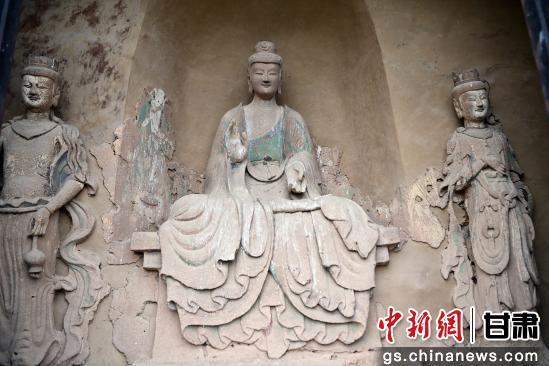 2024年6月4日,甘肅天水,麥積山石窟第44窟的西魏泥塑一佛二菩薩組像。主尊佛像被譽(yù)為“東方美人”。(資料圖)九美旦增 攝