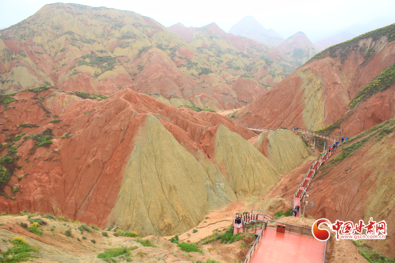 游客們乘坐觀光車沿途游覽,絲路霞光、九色丹青、丹頂攬勝等7個(gè)觀景平臺各具特色,山體色彩斑斕、紋理交錯,雨后更如水墨畫般淡雅別致,與北宋《千里江山圖》、元代《富春山居圖》的意境神似。