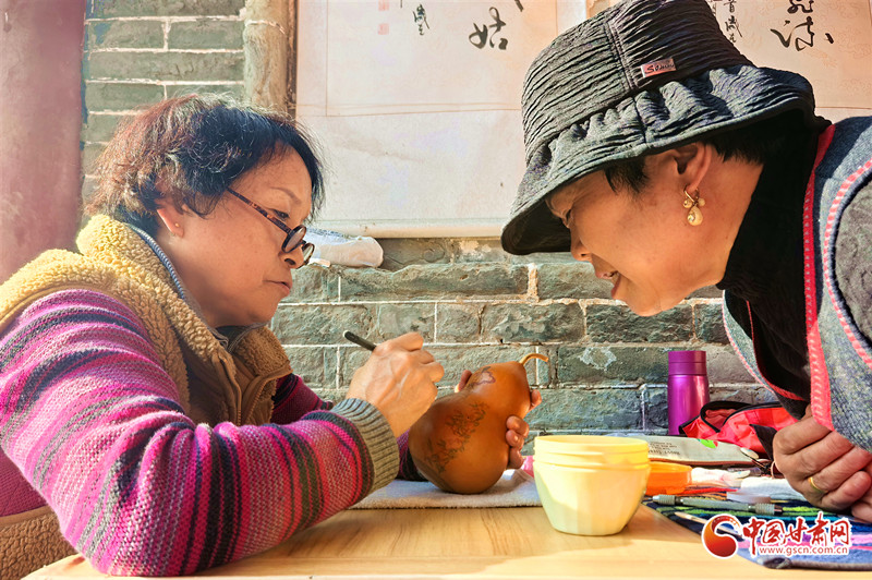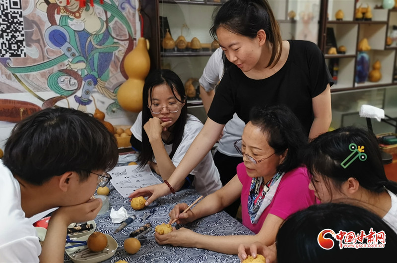 她還走進(jìn)蘭州開(kāi)放大學(xué),為熱愛(ài)刻葫蘆的老年人手把手地傳授技藝,耐心細(xì)致地指導(dǎo)他們?nèi)绾卧谛⌒〉暮J上刻畫(huà)出精美的圖案。