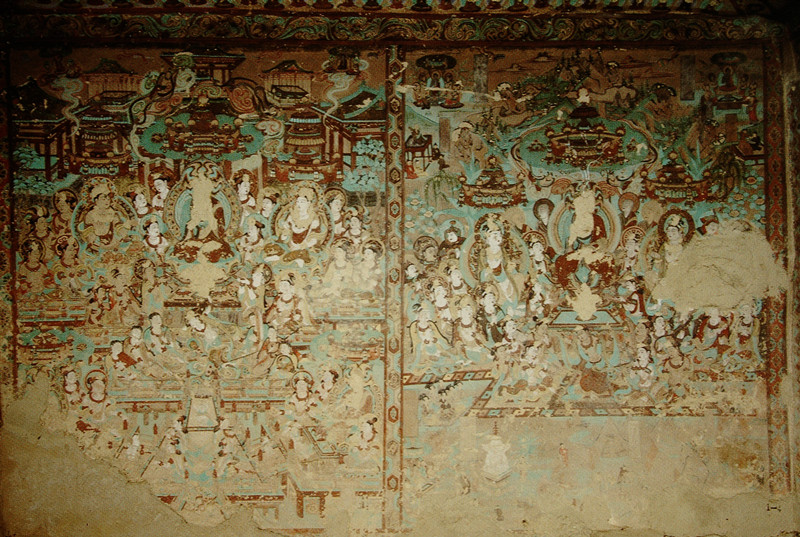 畫面中的人物造型嚴格遵循唐代仕女的畫風(fēng)繪制,顯得豐腴飽滿,恰似盛唐時期雍容華貴的氣質(zhì)寫照。線描寫實明快,流暢飛動,一氣呵成,仿佛是畫師用靈動的筆觸在墻壁上勾勒出的生命樂章。畫面的顏色以石綠、赭黃、鉛白為主色。整個畫面顯得典雅、嫵媚,令人賞心悅目。雖然伎樂天頭部原本貼金的頭飾已經(jīng)剝落,但歲月的痕跡并未減損她雍容華貴的氣質(zhì),反而更增添了一份歷史的厚重感。