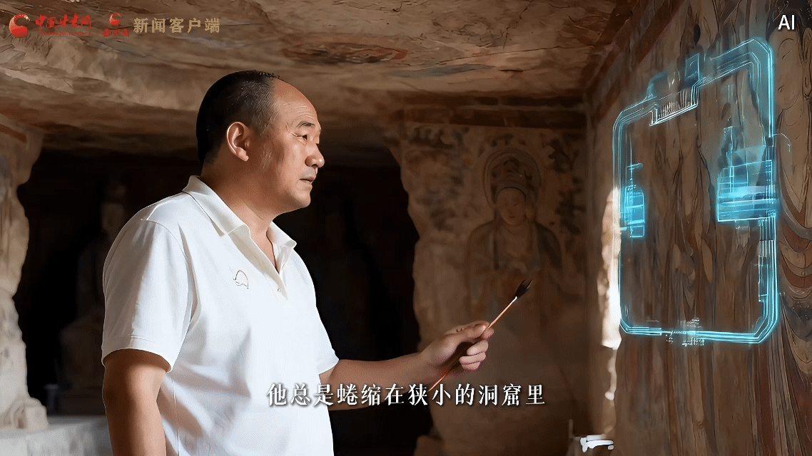 李波接過(guò)父親李云鶴的接力棒,操作AI系統(tǒng)開(kāi)展修復(fù)工作,他遵循 “干一行、愛(ài)一行,鉆一行、精一行” 的理念,從學(xué)徒成長(zhǎng)為“全國(guó)技術(shù)能手”,讓“莫高精神”在戈壁灘延續(xù)。