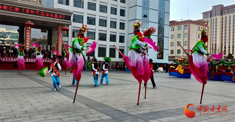 秧歌精華盡在“身子”表演。中郎與臘花姐成雙配對(duì),少則十對(duì)四十人,規(guī)模隨隊(duì)伍靈活增減,女角腳踩一米以上木制高蹺,彩扇絲巾相映成趣。場(chǎng)地表演“舞花場(chǎng)”節(jié)奏明快、走位繁復(fù),行進(jìn)表演舒緩舒展,男引女隨、穿插盤旋,伴奏《十盞燈》《十二個(gè)月》曲調(diào)悠揚(yáng)。進(jìn)退場(chǎng)時(shí),表演者大步狂舞、彩帶飛揚(yáng),鑼鼓齊鳴、鞭炮喧天,將西北年俗的熱烈奔放推向極致。