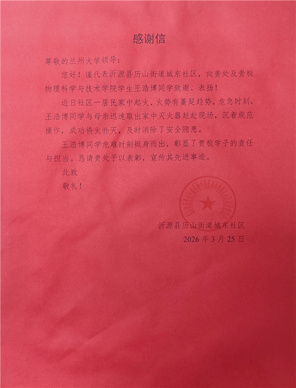 近日,一封社區(qū)致蘭州大學的感謝信,讓該校物理科學與技術學院學生王浩博的暖心事跡走進公眾視野。2026年3月3日,元宵夜,放假居家的他偶遇居民樓突發(fā)火情,憑借校園培訓習得的消防技能,沉著處置初起火災、轉(zhuǎn)移危險物品,以本能之舉守護鄰里安全,彰顯新時代青年的責任與擔當。