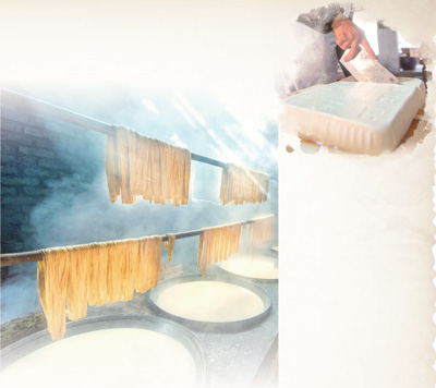 農家豆腐講究口感,個頭飽滿的土黃豆,清冽甘甜的山泉水,酸度適中的漿水湯,農家傳統(tǒng)的柴火灶,是必不可少的四件料。缺一樣,山野豆子就不能在清水中爆裂出植物的原香,沸騰的豆?jié){就開不出雪白的豆花兒。