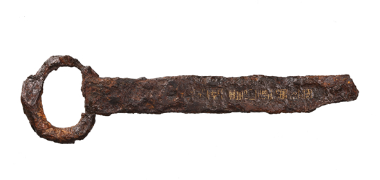 顧名思義,金馬書刀的得名與刀身上的馬形圖案有直接關系。文獻記載,漢代蜀地所產(chǎn)的金馬書刀馳名天下。西晉學者晉灼為《漢書》作注時提到:“舊時蜀郡工官作金馬削刀者,以佩刀形,金錯其拊(柄)。”東漢人李元有《金馬書刀銘》傳世:“巧冶煉剛,金馬托形。黃文錯鏤,兼勒工名。”用黃金錯鏤出馬的形象以及工匠姓名,跟實物遺存的特征相吻合。